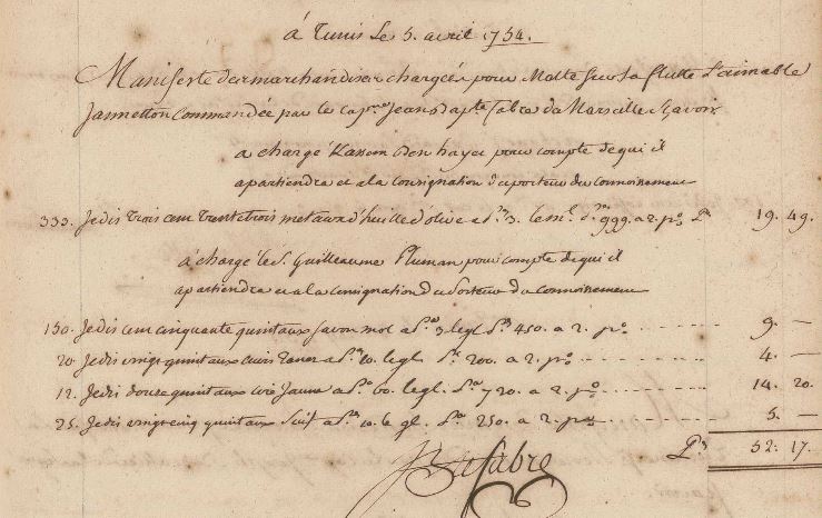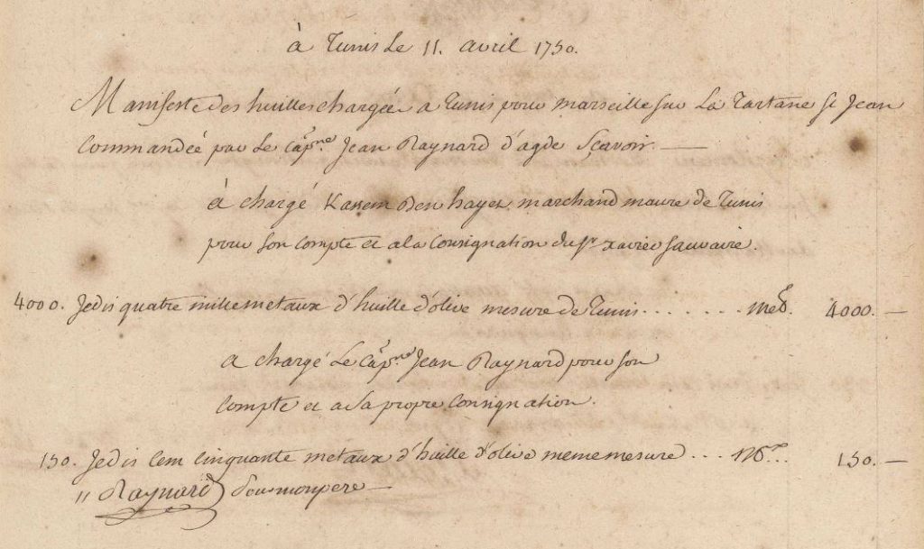 L’an mil sept cent cinquante et le cinquième jour du mois de Mars avant midy, par devant nous chancelier du Consulat de France en cette ville et Royaume deTunis soussignés et témoins sous nommés en comparu le capitaine Jean Raynard d’Agde commandant la Tartane appelée Saint-Jean actuellement ancrée en cette rade de la Goulette lequel de son gré en a nolisé et nolise par le présent, l’Estive d’un paraper à l’autre de la portée qu’elle se trouve au Sieur Jean Ange Capriata marchand génois et au nommé Kassem Ben Hayer (ayed) marchand maure de cette ville, tous les deux icy présents stipulant et acceptant pour un voyage à faire de sortie de cette rade de la Goulette à Marseille ou ce voyage sera fini et terminé aux conditions suivantes à savoir que le capitaine accorde à ses nolisataires trente jours courants d’Estarie en tous lequels commenceront à compter samedy prochain septième du courant mois et quinze jours de surestarie si besoin est à raison de deux sequins et demy barbaresques par jour payables journellement passé lequel temps le capitaine pourra se mettre à la voile chargé ou non et les nolis luy seront toujours payés le vide pour le plein le capitaine se réserve la chambre dans laquelle logera néanmoins trois passagers au gré des nolisataires et toutes les cloisons ordinaires pour les vivres et câbles, il se réserve également la portée de deux cent quintaux de marchandises lesquelles seront procées de quelques natures q’elles soient dans l’Estive du bâtiment. En mer le dit capitaine relachera à Calliery ou donnera deux jours à ses nolisataires pour y débarquer un des passagers lequel payera tous les frais occasionner par la relache du bâtiment au dit jour. Les frais concernant le bâtiment comme assurage et avarie seront payés par le dit capitaine et tous ceux occasionner par la marchandise comme arrimage bateaux pour l’embarquement et débarquement et autres généralement quelconques seront supporter par le di nolisataire. Le présent nolisement pour le prix du voyage et fait et passé le prix et somme de six cent quarante écus monaye de Sardaigne que le di nolisataires promettent et obligent judiciairement de payer à Marseille au capitaine quinze jours après la quarantaine du bâtiment pour le prix de quatre livres dix sols tournois pour chacun des … en paix et sans difficulté ainsi d’accord entre les parties lesquelles pour l’observation du contenu au présent acte oblige leurs biens présents et à venir à toutes leurs justice requises et conjure. Fait et publié au dit Tunis en chancellerie en présence des sieurs Jacques Viller et Louis Crozet négociants français résident en cette ville, témoins requis qppeler et soussigné avec les parties et.nous chancelier au présent original.