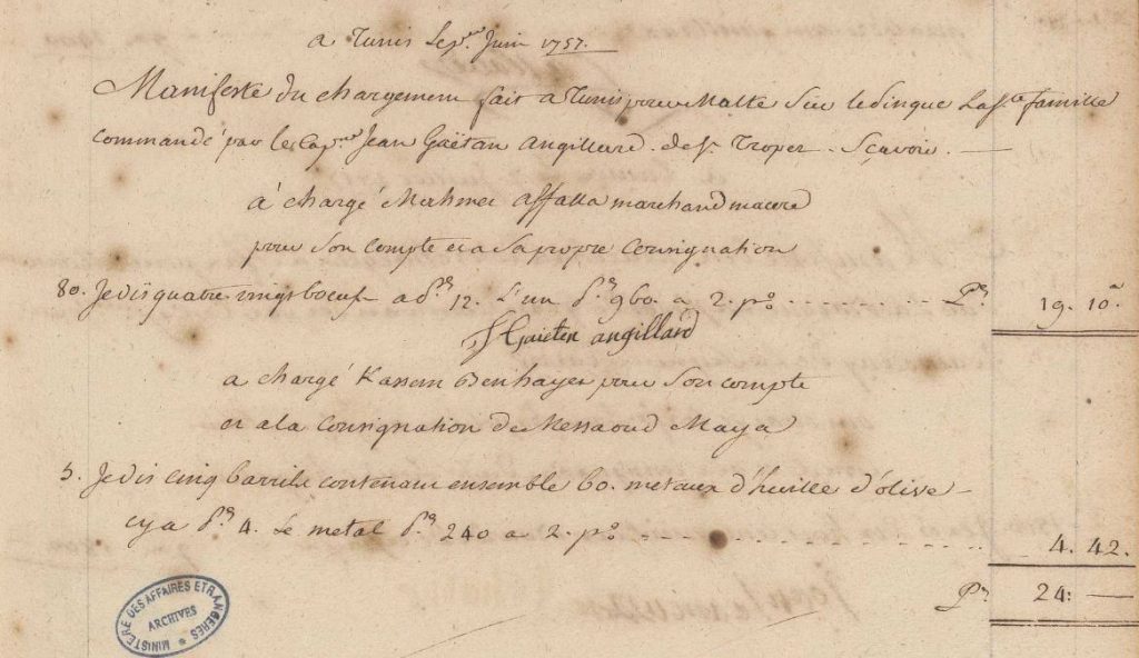 L’an mille sept-cent quarante huit et le vingt troisième jour du mois d’octobre avant midi par devant nous chancelier du Consulat de France en cette ville et Royaume de Tunis soussignés et témoins sous nommés à été en sa personne le Capitaine Pierre Béranger de la Ciotat, commandant la Polacre appelée La Providence amarée actuellement en cette Rade de La Goulette, lequel de son gré a nolisé et nolise par ces présentes l’Estive et l’Entrepont de sa Polacre d’un parapet à l’autre du pont qu’elle se trouve à Sidy Kassem Ben Ayed et Ahmed Ahdiden, marchands maures ici présents et acceptant pour un voyage à faire de sortie de cette Rade de La Goulette aux Gerbis, à Modon et à Smyrne et le retour à Scio, aux Modon et en cette Rade de La Goulette ou le voyage sera fini et terminé et c’est aux conditions suivantes, à savoir que le capitaine aux nolisataires … à commencer d’aujourd’hui et vingt cinq jours de … à raison de trois sequins barbaresques par jour payables journellement, passé lequel le Capitaine pourra se mettre à la voile chargé ou non et les nolis lui seront toujours payés la veille pour le lendemain, le Capitaine se réserve la chambre dans laquelle il ne pourra mettre des marchandises pour son compte qu’après que les nolisataires auront chargé les bâtiments il se réserve aussi la Barde, les Soutes, la fosse au câbles, le chambron appartiendra aux nolisataires, qui embarqueront quinze passagers francs de nolis sur la couverte des nolisataires. Le présent nolissement pour le seul voyage en faire et passé pour le prix et la somme de six cent soixante sequins barbaresques et cinq … pour le Capitaine tous de poids, de bon or sans trous payables et avoir la moitié à Smyrne …